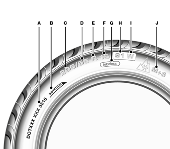 El esquema muestra y explica la información del fabricante del neumático que puedes leer en el neumático.A: Semana y año de fabricación "3516" = semana 35, 2016
